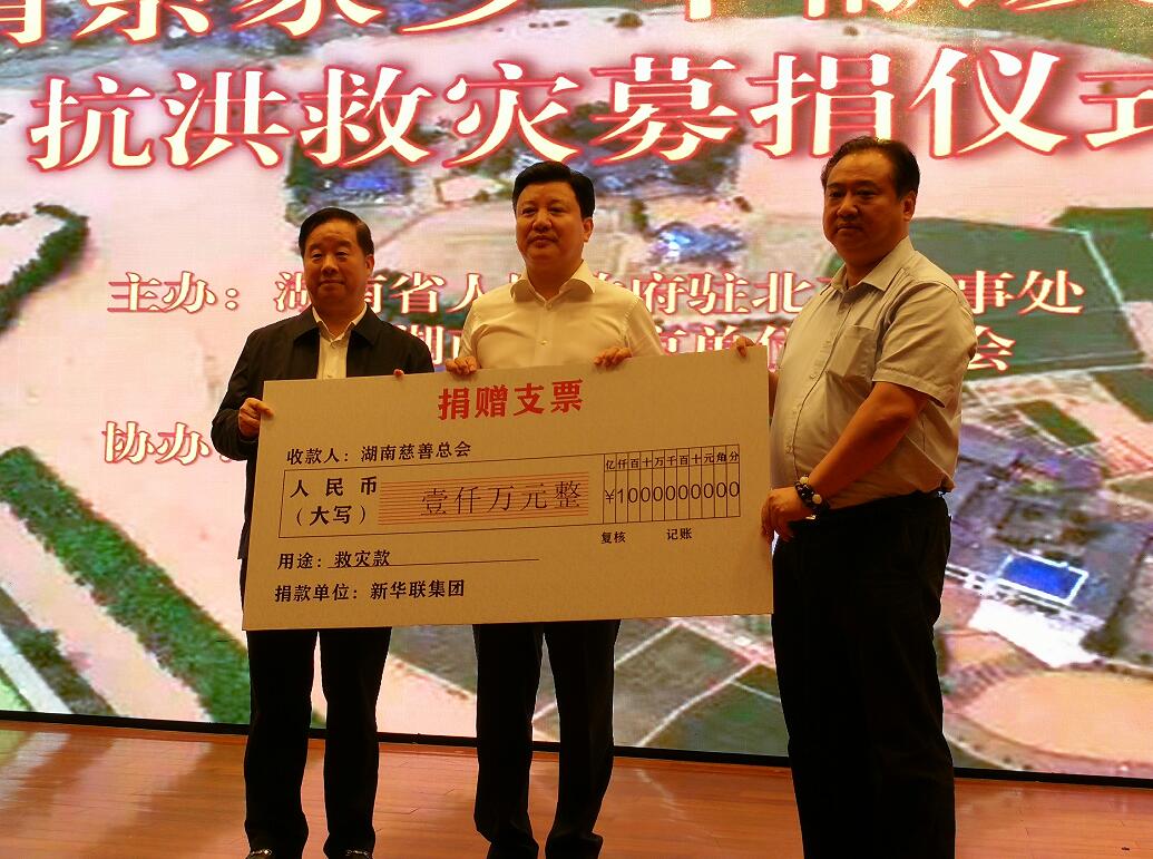 6月起,湖南大范圍被暴雨連續襲擊,降水總量達到860億立方米,相當于5個洞庭湖水量,較1998年同期偏多20.8%。降雨總量之多、范圍之廣、強度之大、歷時之長、洪峰水位之高均為歷年罕見。湖南的災情引起了社會各界的關注。新華聯集團緊急決定于危難之中伸出援手,迅即向湖南捐款1100萬元,用于抗洪救災及災后重建工作。