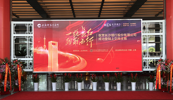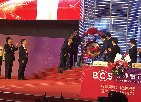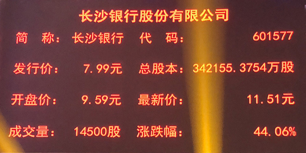 9月26日上午9時30分,隨著上市銅鑼的敲響,長沙銀行股份有限公司正式登陸上交所主板,股票代碼601577,成為湖南省首家A股上市銀行、A股第28家上市銀行。長沙銀行發行價為每股7.99元,開盤價每股9.59元,開盤后股價沖高至每股11.51元,大漲44.06%。