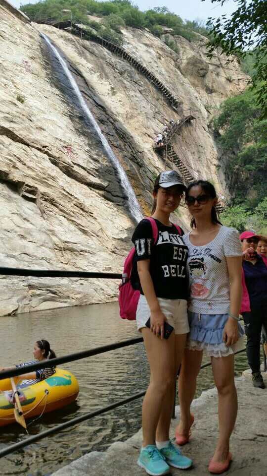 進入景區步行不久便來到了“桃源瀑”,千丈青山襯著一道白練的美麗景象映入眼簾。一條“白練”從天而降,攜風帶水,縹緲輕靈,猶如隨風飄灑的白色絲帶,舞動曼妙的身姿,悠閑自在地從絕壁上飛騰而下,撞擊著崖下的巖石,水珠飛濺。一旁的“青龍天梯”砌石而上,架在“桃源瀑”石壁上,高80米,共163級臺階,僅可通人。從下往上仰望,猶如一條青龍直沖霄漢。